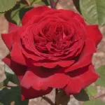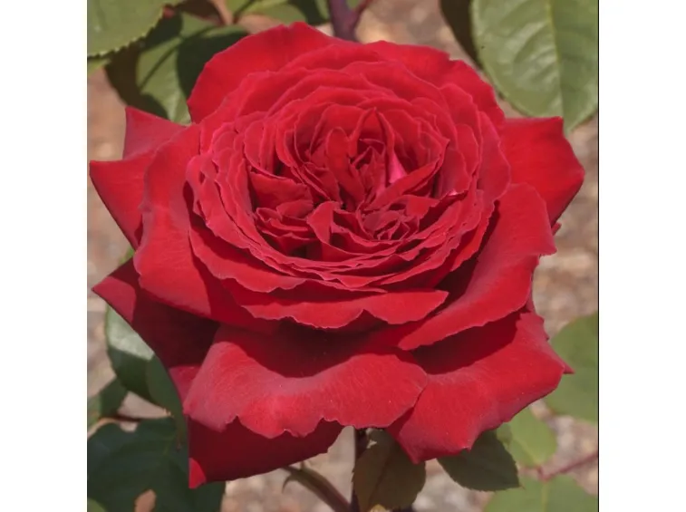 The flowers are large, very double (90–100 petals), and compact, cup-shaped, about 13 cm in diameter, with a vivid red color and intense fragrance.