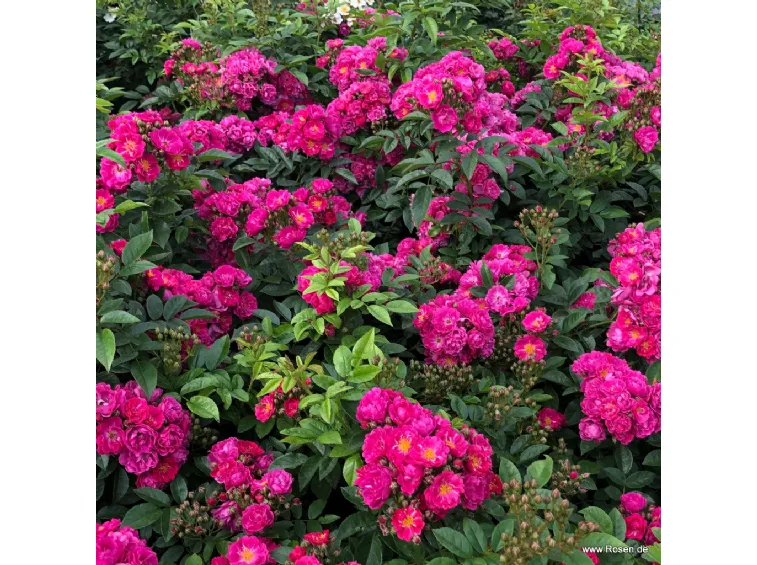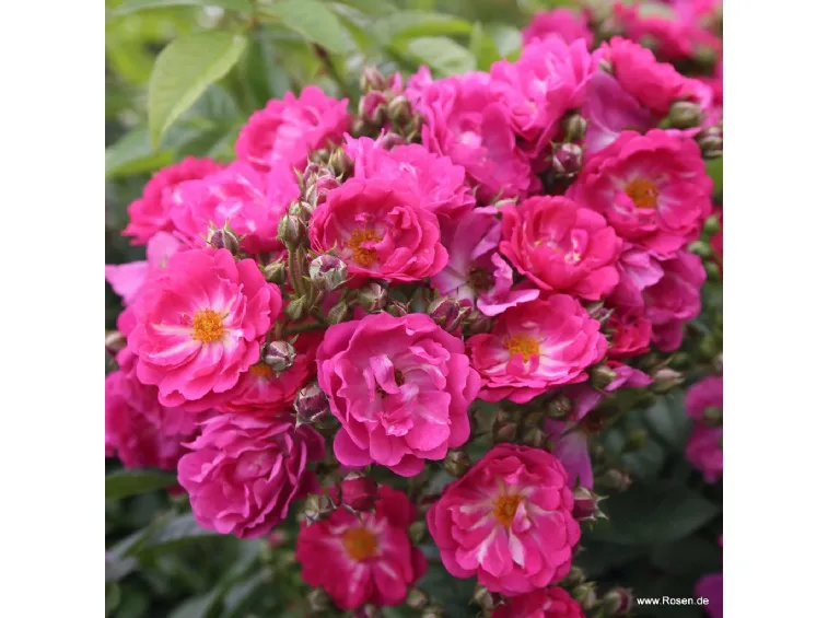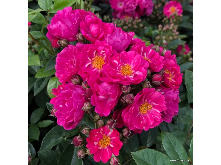 The double cup-shaped flower, with a 4 cm diameter, is an intense pink, and it blooms in clusters with a pleasant fragrance, featuring visible yellow stamens. It has moderate vigor and excellent disease resistance, reaching heights of up to 170 cm and widths of 70 cm.
