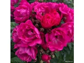 Large, double, full flower of 11 cm in diameter, composed of more than 40 dark red petals. Slightly scented, it is reblooming. Vigorous, it grows erect and well branched up to 350 cm in height and 100 cm in width. Healthy and with good disease resistance, it has semi-glossy dark green foliage. Introduced by Poulsen Roser A / S in 1997 it is part of the Courtyard® collection; tolerates exposures to the North and cultivation in pots.