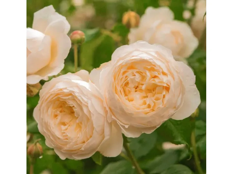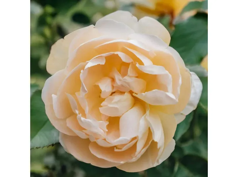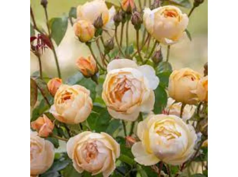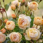 The flowers are medium-sized and cup-shaped, about 5 cm in diameter, borne in clusters and composed of approximately 33 fragrant apricot-yellow petals. The plant has a compact, well-bushed, upright growth habit, reaching around 110 cm in height and 125 cm in width.