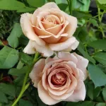 The double cup-shaped flower, with a 10 cm diameter, is composed of approximately 40 petals in the extraordinary and unique 'Café au lait' color that gradually transitions into shades of lavender and chocolate as it ages.