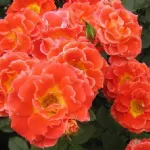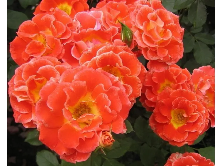 A semi-double, flat bloom with a diameter of 10 cm, composed of approximately 16 red-orange petals with a white border. The flowers grow in small clusters, are reblooming, and have a light fragrance. The plant reaches up to 90 cm in height, with dense, upright branching and very few thorns. It has healthy, large, semi-glossy foliage in a bronze-green hue.