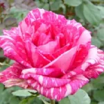 Elegant double cup-shaped flower, 12 cm in diameter, composed of approximately 40 petals in shades of pink with dark streaks; delicately scented.
