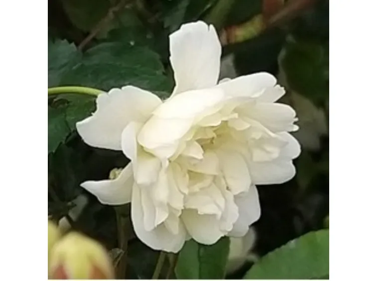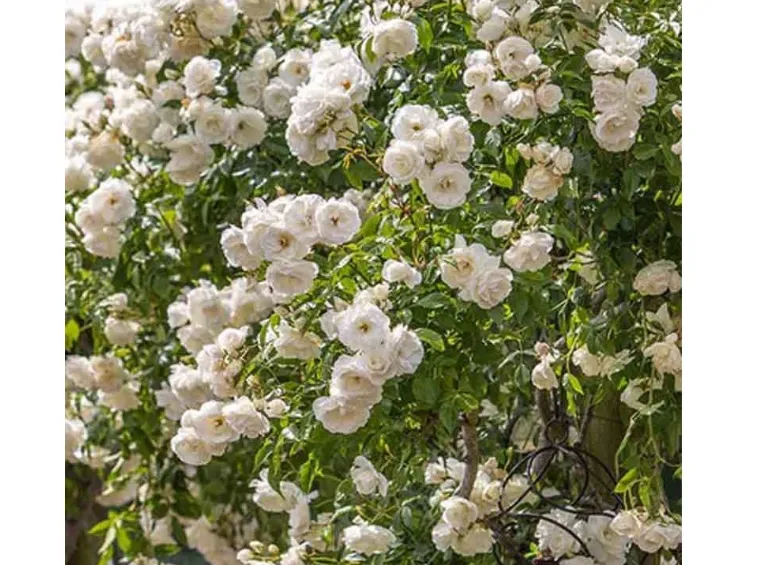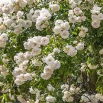 The flowers are pom-pom shaped, small, double, borne in clusters along the branches, about 1.5–2 cm in diameter, composed of more than 21 pure white petals with a delicate violet-like fragrance. Flowering is abundant but occurs only once, typically in spring or summer.