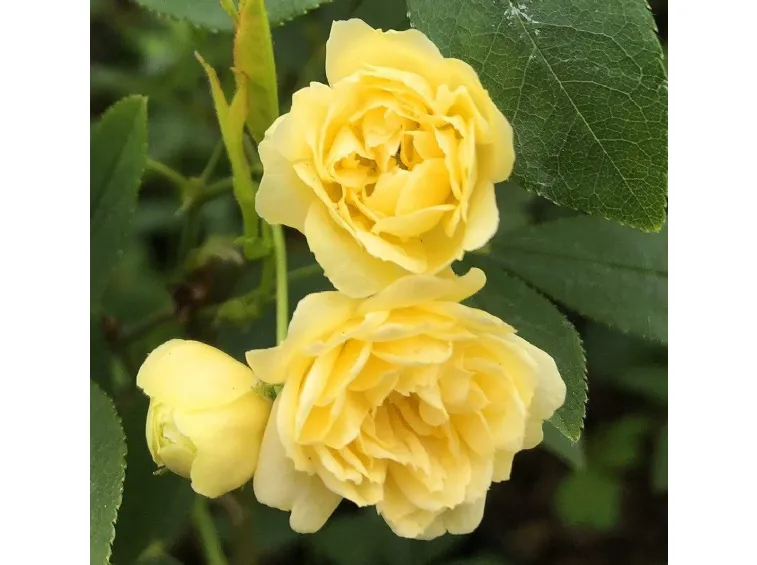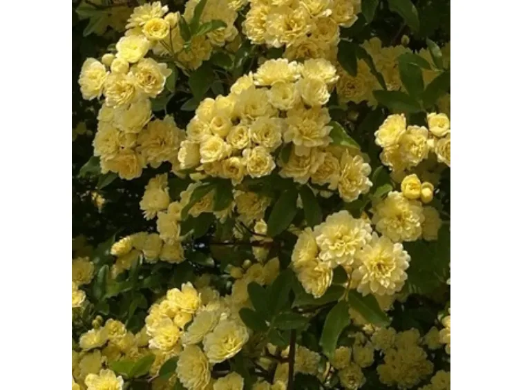 The flowers are small, double, and cup-shaped, about 2 cm in diameter, composed of more than 40 delicately scented yellow petals, borne in clusters. Flowering is abundant but occurs only once per season.