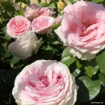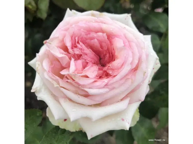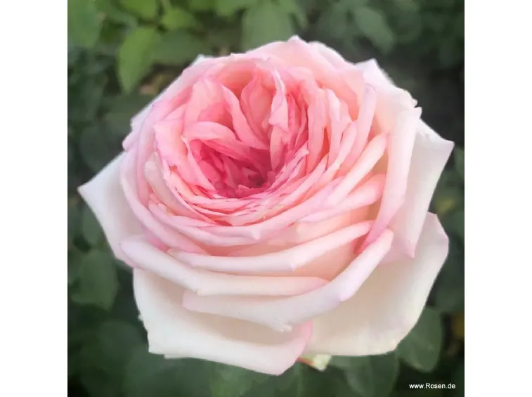 The romantic, densely double cup-shaped flower has a diameter of 10 cm, composed of approximately 40 petals in an elegant creamy pink color, emitting a delightful spicy fragrance. It reblooms and is both healthy and robust, with an upright and well-branched growth reaching heights of up to 100 cm and widths of 40 cm. Its semi-glossy dark green leaves add to its charm.
