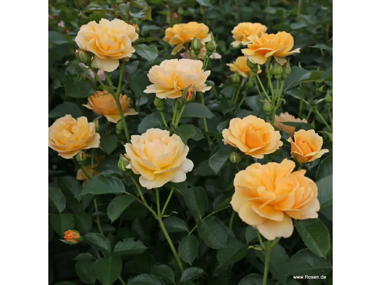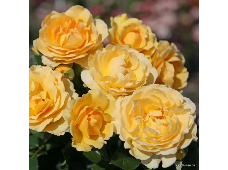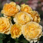 The double cup-shaped flower, with an 8 cm diameter, is composed of 25 twirling, lightly fragrant, golden-yellow petals. It reblooms and is highly disease-resistant, blooming in rich clusters. It grows compact and bushy, reaching heights of up to 70 cm and widths of 40 cm.