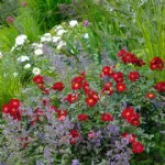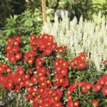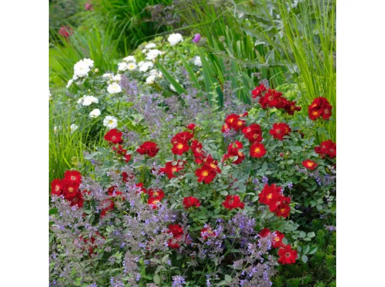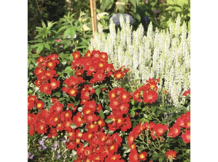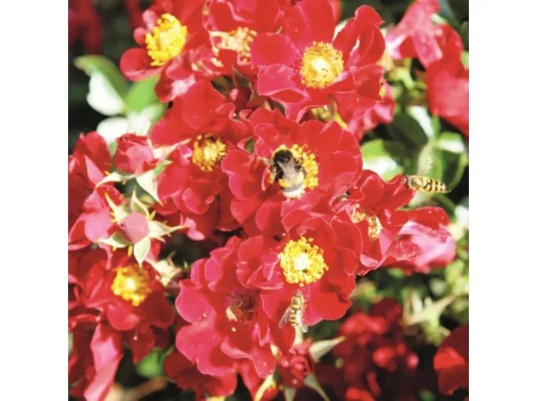 Flowers displayed in bunches, semi-double, rosette-shape flower, 2.5 cm in diameter, with 5-8 red petals. The flowers are very appreciated by bees for their abundant supply of pollen. Very re-flowering and resistant to diseases, self-cleaning, it is bushy, compact, reaches 60 cm in height and 60 in width. The foliage is shiny, dark green. Introduced in 2013 by Rosen-Tantau, it won the Bronze Medal at the Baden-Baden Rose Competition in 2014 and was awarded the Honorary Award of the German Ministry of Environment, Agriculture, Nature and Consumer Protection NRW for " particularly bee-friendly innovation in the rose range "in 2019.